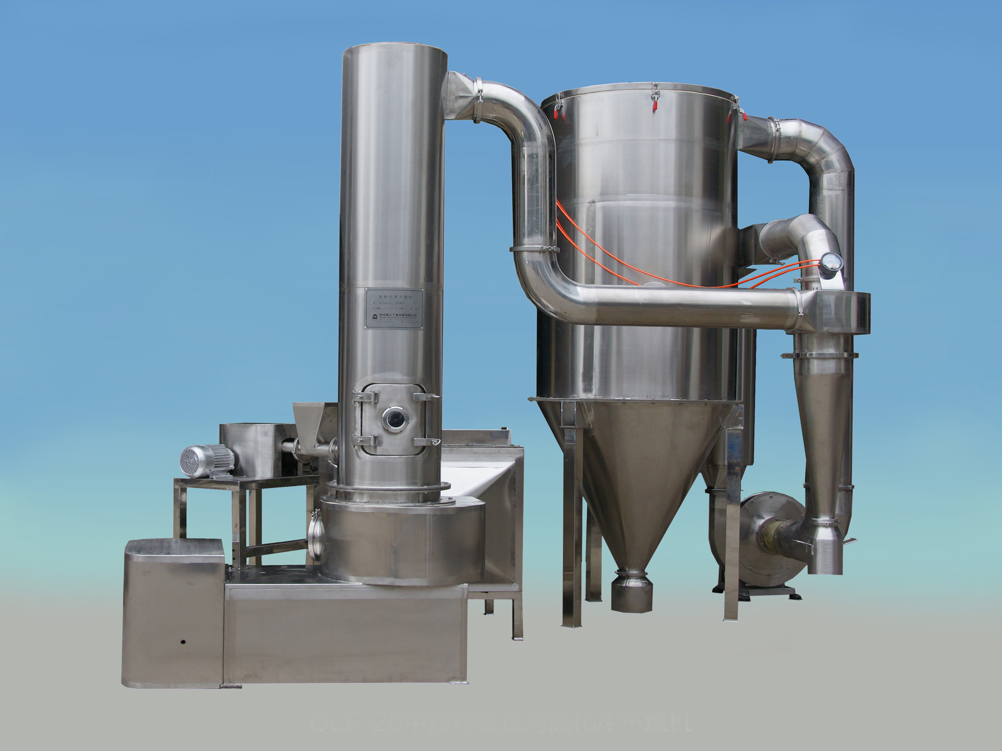 閃蒸干燥機(jī),國內(nèi)也稱為旋流干燥機(jī)或旋轉(zhuǎn)快速干燥機(jī),是近年來發(fā)展迅速且應(yīng)用廣泛的干燥設(shè)備之一。它巧妙地結(jié)合了流化、旋流、噴動、粉碎和分級技術(shù),是流化技術(shù)、旋流技術(shù)、噴動技術(shù)及對流傳熱技術(shù)的優(yōu)化組合。這種設(shè)備技術(shù)含量高,適用于膏糊狀、顆粒狀、濾餅狀及泥漿狀物料的干燥。